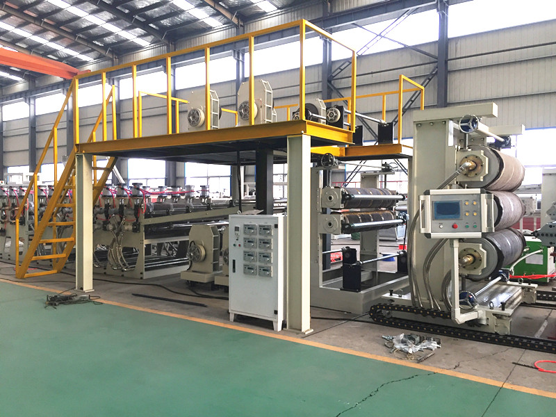 उत्पादन लाइनको कम्पोजिट डाइ हेडले T-आकारको संरचना देखाउँछ र P20 मोल्ड स्टिलबाट बनाइएको छ, जसको फ्लो च्यानल सतह Ra 0.05 μm छ। डाइ हेडमा नौ तताउने क्षेत्रहरू छन्, 27 kW को ताप शक्ति, र अधिकतम उत्पादन चौडाइ 1,300 mm, extruded PE कोर तहको मोटाई र समतलताको सटीक नियन्त्रण सक्षम पार्दै। थ्री-रोल क्यालेन्डरमा 500 × 1,500 मिमीको प्रभावकारी कार्य सतह आयाम छ। रेखा गति 0.5 देखि 8 m/min सम्म ABB चर गति नियन्त्रण प्रणाली प्रयोग गरी ठीकसँग समायोजित गर्न सकिन्छ, एक चिकनी पाना सतह सुनिश्चित गर्न।